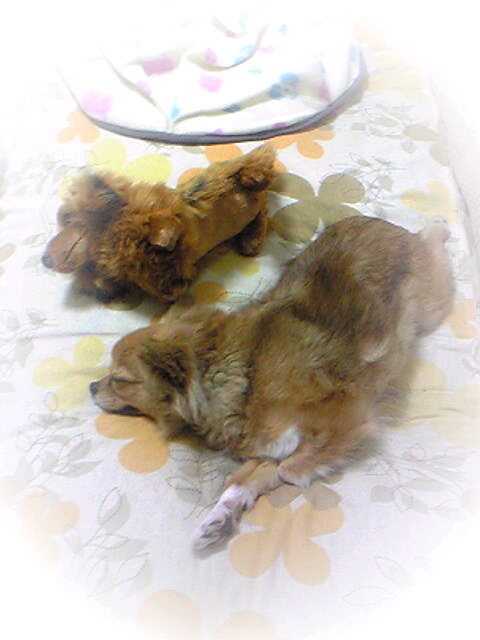 チーコですお友達の犬のぬいぐるみと仲良くお昼ねタイム・・・ 同じ格好で寝てます(笑) あたしも一緒にお昼ねしたい